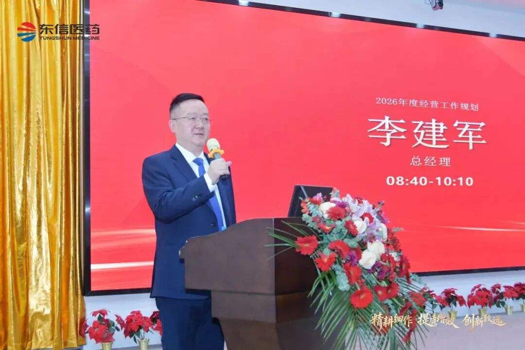 东信医药总经理李建军作2026年度经营工作报告。在报告中,李总回顾了公司各部门在过去一年中所取得的成绩和存在的不足,并结合行业政策的变化、市场的发展趋势,提出了东信医药2026年的经营目标、重点任务和工作要求。