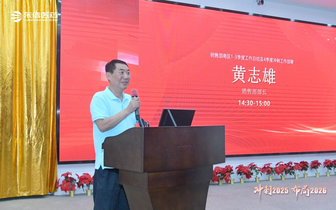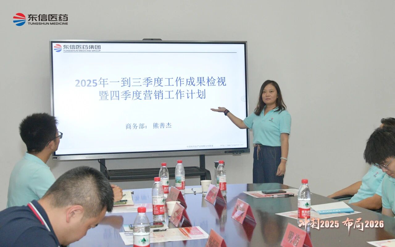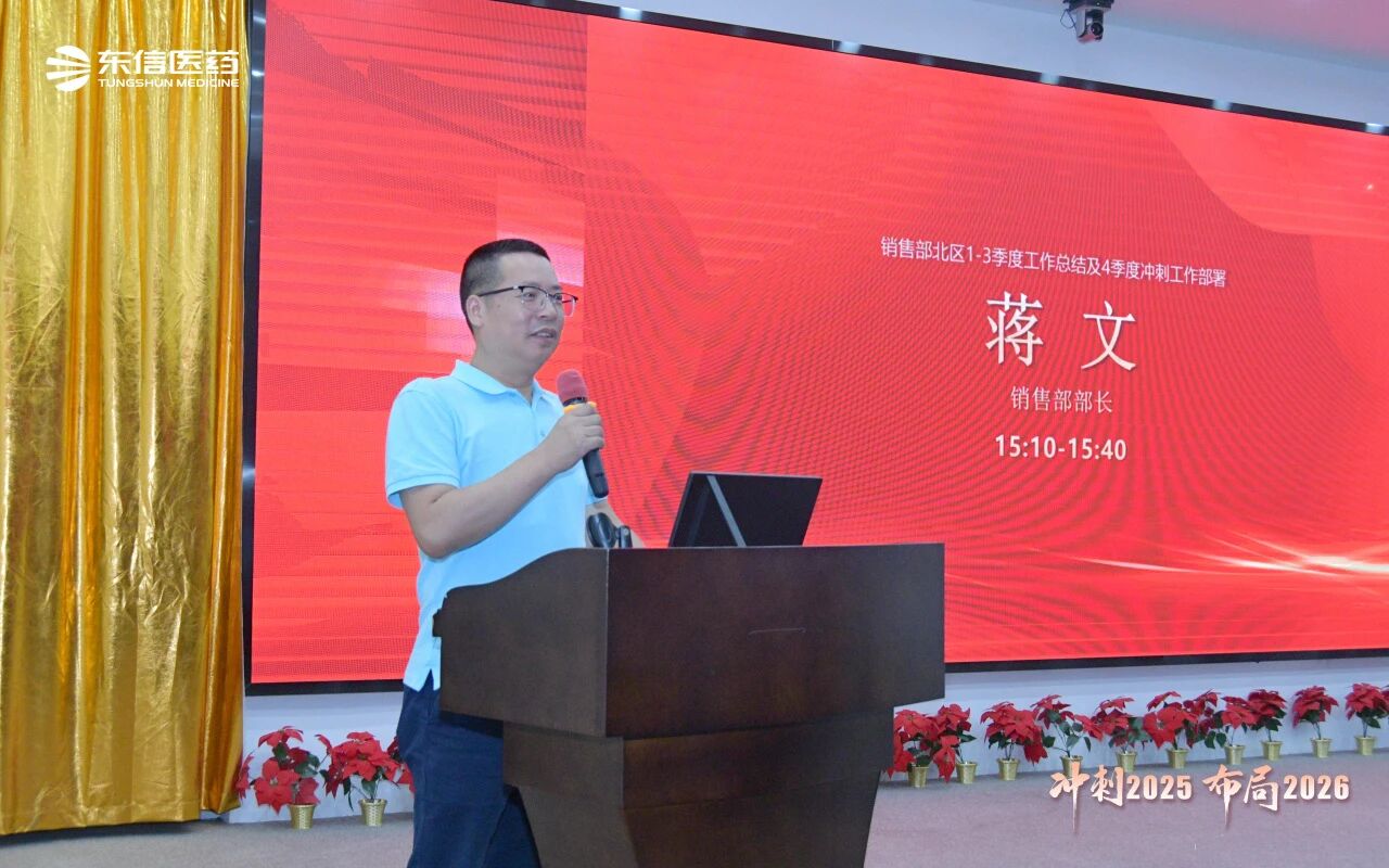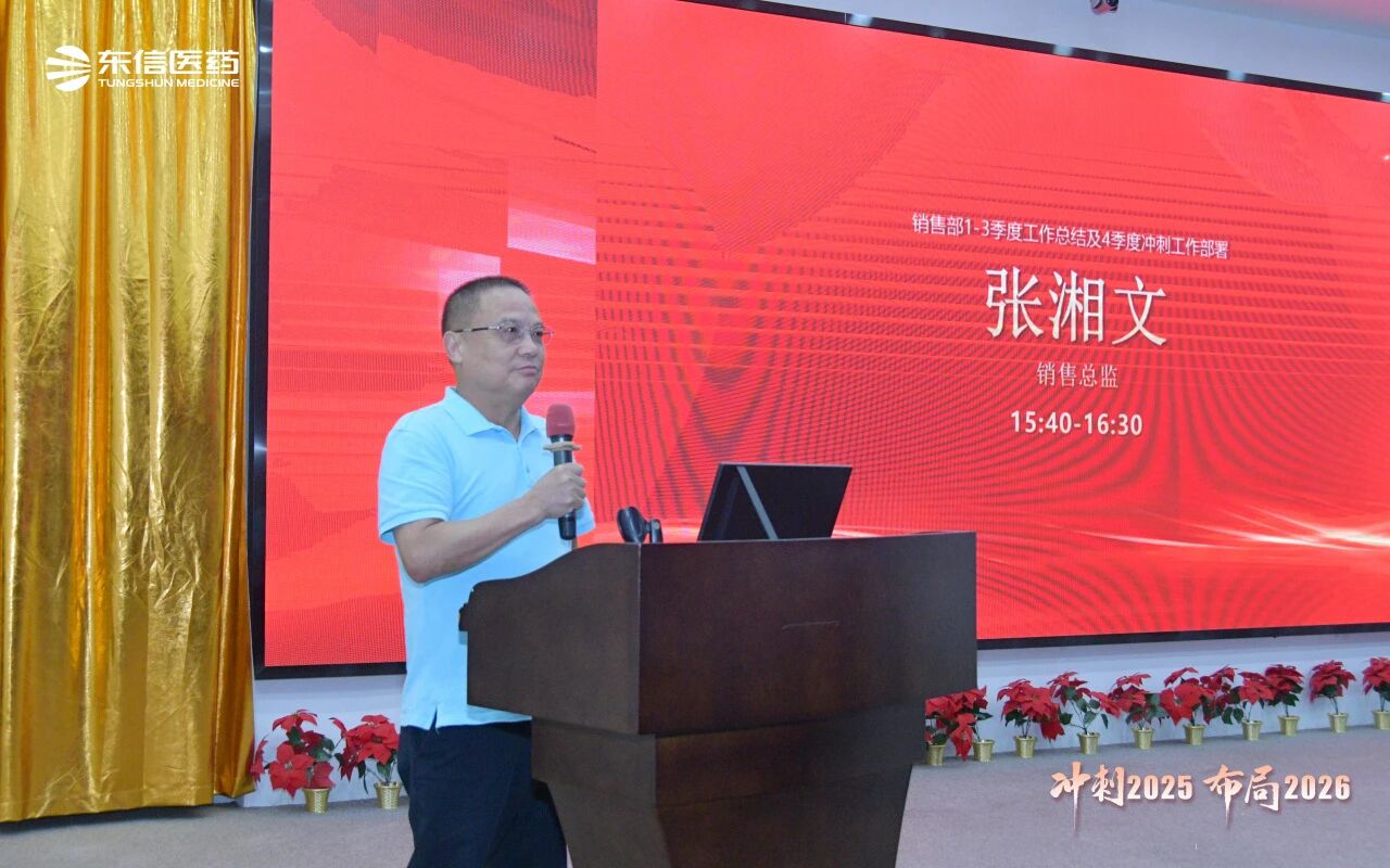 销售总监张湘文全面总结销售部前三季度的业绩达成情况,并针对多项重点工作提出具体要求:一是确保完成四季度任务目标;二是稳步推进五大工程落地;三是有序开展秋季PK活动;四是推动区域重点产品实现深度突破;五是加大OTC产品推广力度;六是落实省际联盟集采相关工作;七是科学制定2026年销售计划。